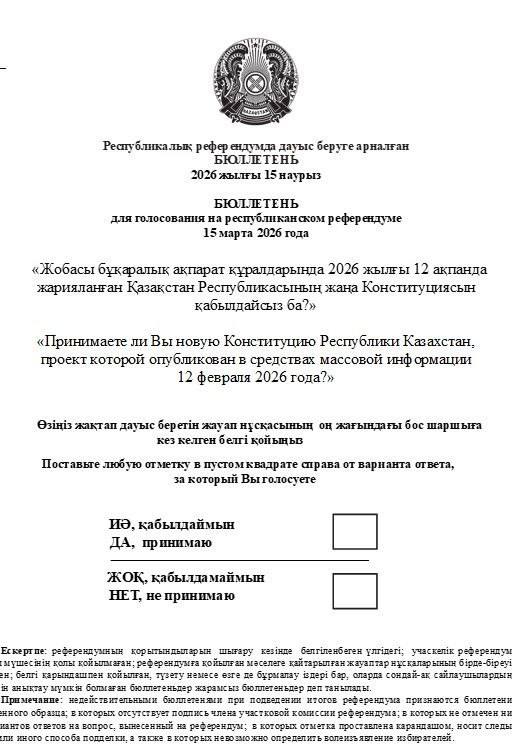 Орталық сайлау комиссиясы 15 наурызда өтетін республикалық референдумға арналған бюллетеньнің ресми нұсқасын таныстырды. Құжатта азаматтарға бір ғана нақты сұрақ ұсынылады, - деп хабардайды Dauletten.kz.